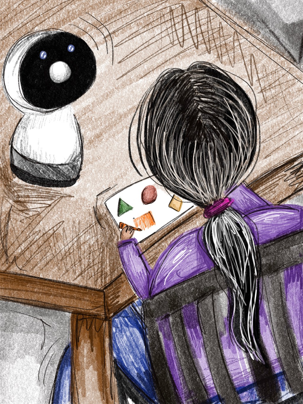 - Phase de démonstration créative : Dans cette phase, Jibo est programmé pour agir de façon créative, ajoutant des éléments originaux au dessin. L’idée était de déterminer si les comportements créatifs du robot pouvaient stimuler la créativité des enfants.